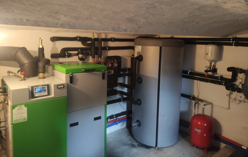 Zamontowaliśmy im kocioł na pellet o podwyższonym standardzie. Kocioł SAS BIO COMPACT PLUS 10kW oraz Kolektor hydrauliczny (TermoJet K22G 125.50) + grupa pompowa (TermoJet GP48L) + grupa pompowa (TermoJet GP47L). Wymieniliśmy orurowanie od bufora do kolektora i do grzejników oraz od bufora do kolektora i do zbiornika cwu i dalej do punktów poboru. Wyczyściliśmy instalację co oraz przerobiliśmy instalację CO związane ze zmianą obiegu z otwartego na zamknięty.